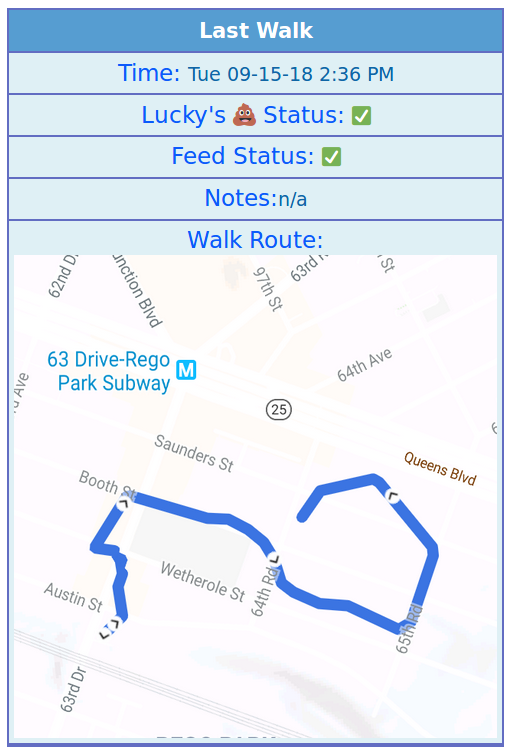 This package includes one, approximately 20 minute walk, every weekday afternoon. We'll also feed your dog as per your instructions. This package costs $269 per month. You'll receive a notification sent to your phone and email after each walk. This notification will include a link to gps map showing the route we took (image below), and details regarding the walk.